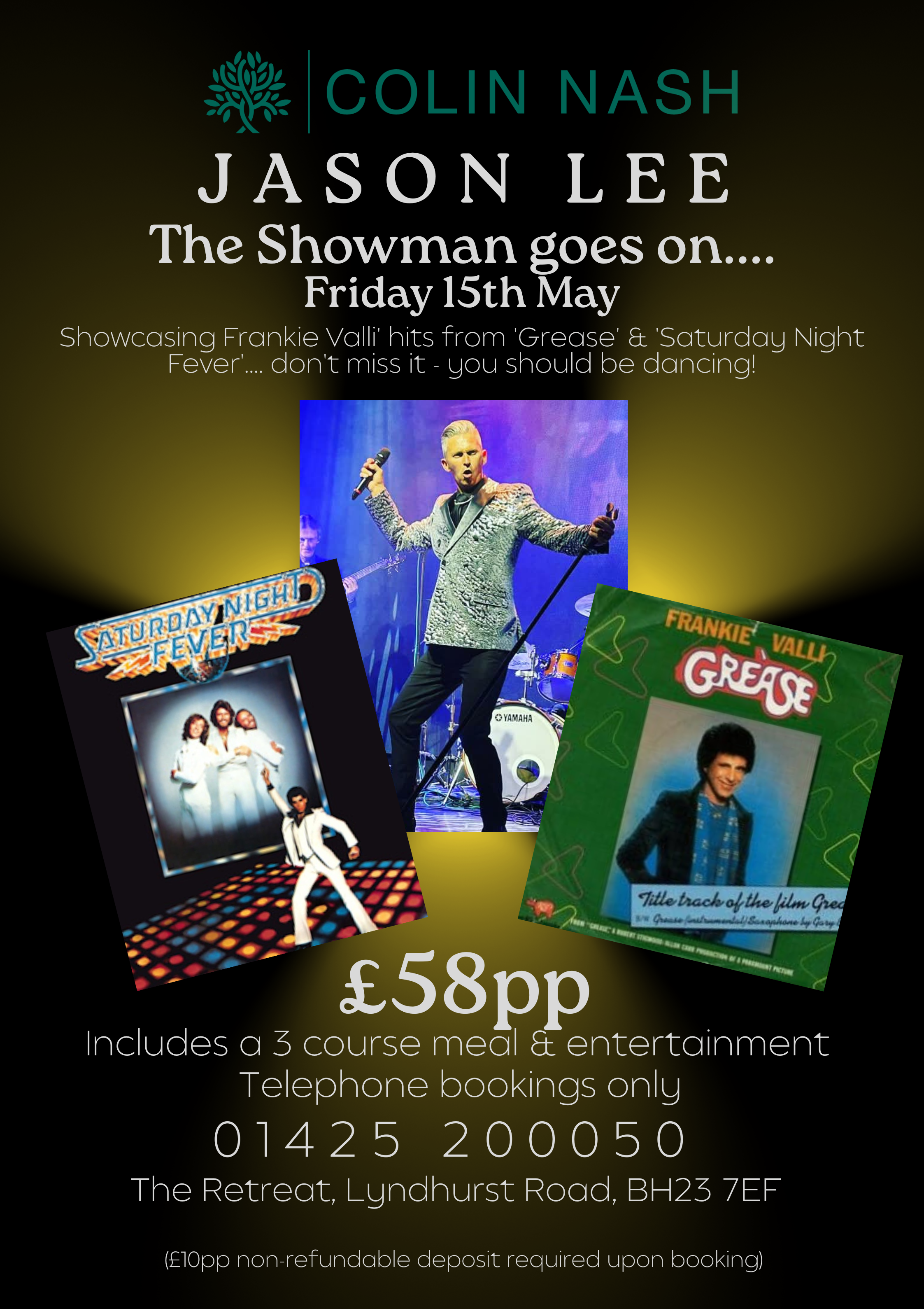 Dive in to an evening with ‘Jason Lee’, bringing you amazing show classics such as ‘Frankie Valli’, ‘Grease’ & ‘Saturday Night Fever’.